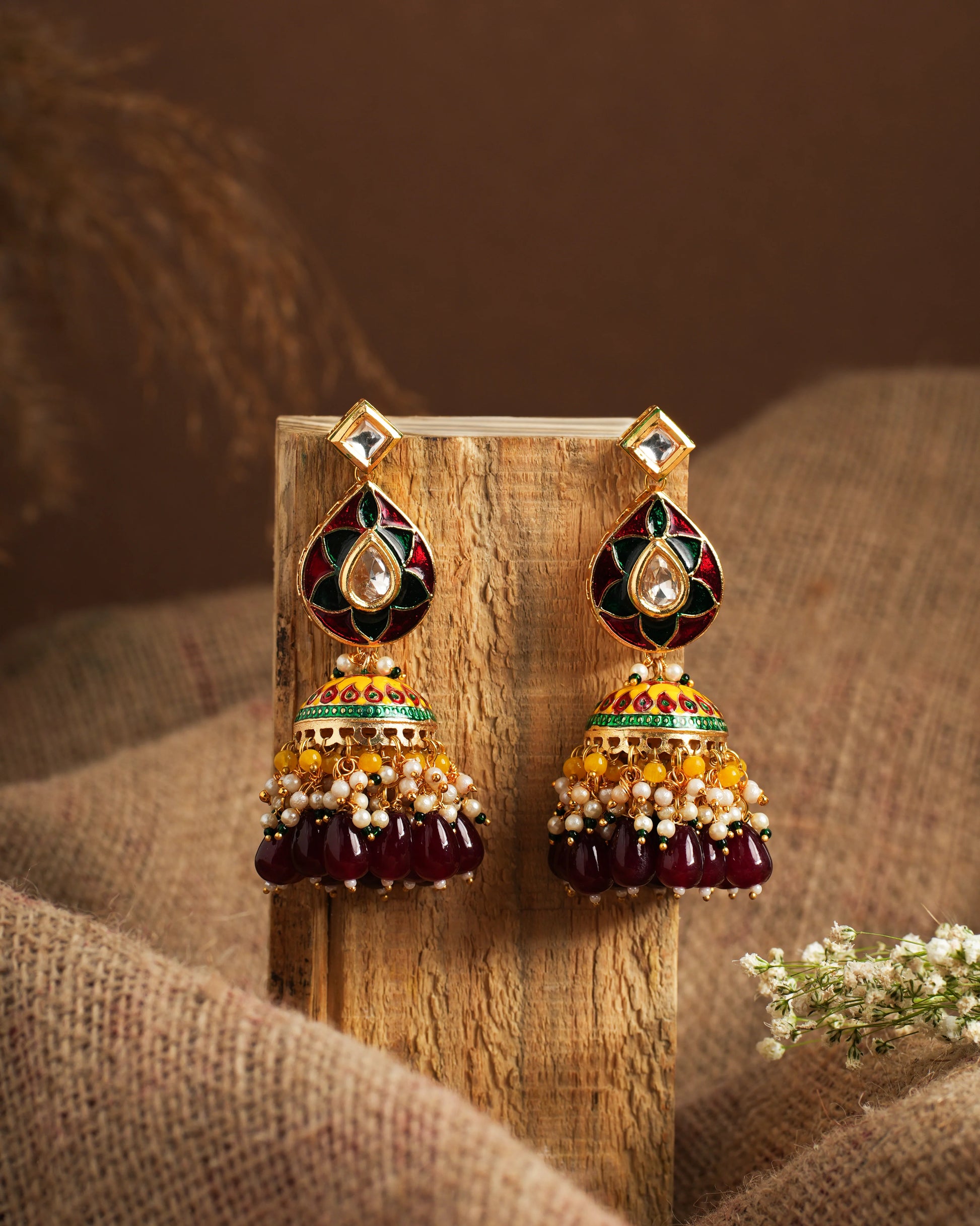Infuse your style with regal charm through these Vintage Maroon & Gold Meenakari Jhumka Earrings. Featuring an elegant teardrop-shaped Kundan stud with floral Meenakari accents in red, green, and black enamel, the earrings descend into intricately crafted domes adorned with layers of mustard yellow, pearl, and deep maroon bead hangings. This exquisite piece is perfect for traditional outfits, festive occasions, and wedding celebrations.